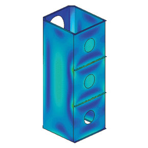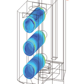先進的FLUENT軟件模擬流體動力學,結構力學和聲學分別模擬了DFO型號1-12-23-3的性能等級。而下面(左圖)顯示了利用FLUENT軟件作流量測試,從而令DFO 3-3內部的氣流速度更均勻分布。另外下右圖顯示了利用ANSYS®*結構分析軟件測試DFO 3-3,在正常工作壓下之內部壓力分布測試。